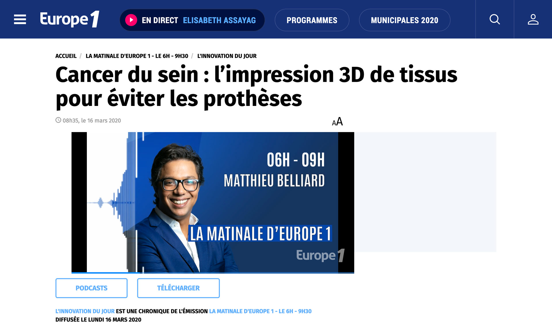Listen to this radio forecast which explains how 3D bioprinting of tissues will allow avoiding synthetic implants. Anicet Mbida presented our project on Europe 1 in March 2020 as part of the key innovative technologies.